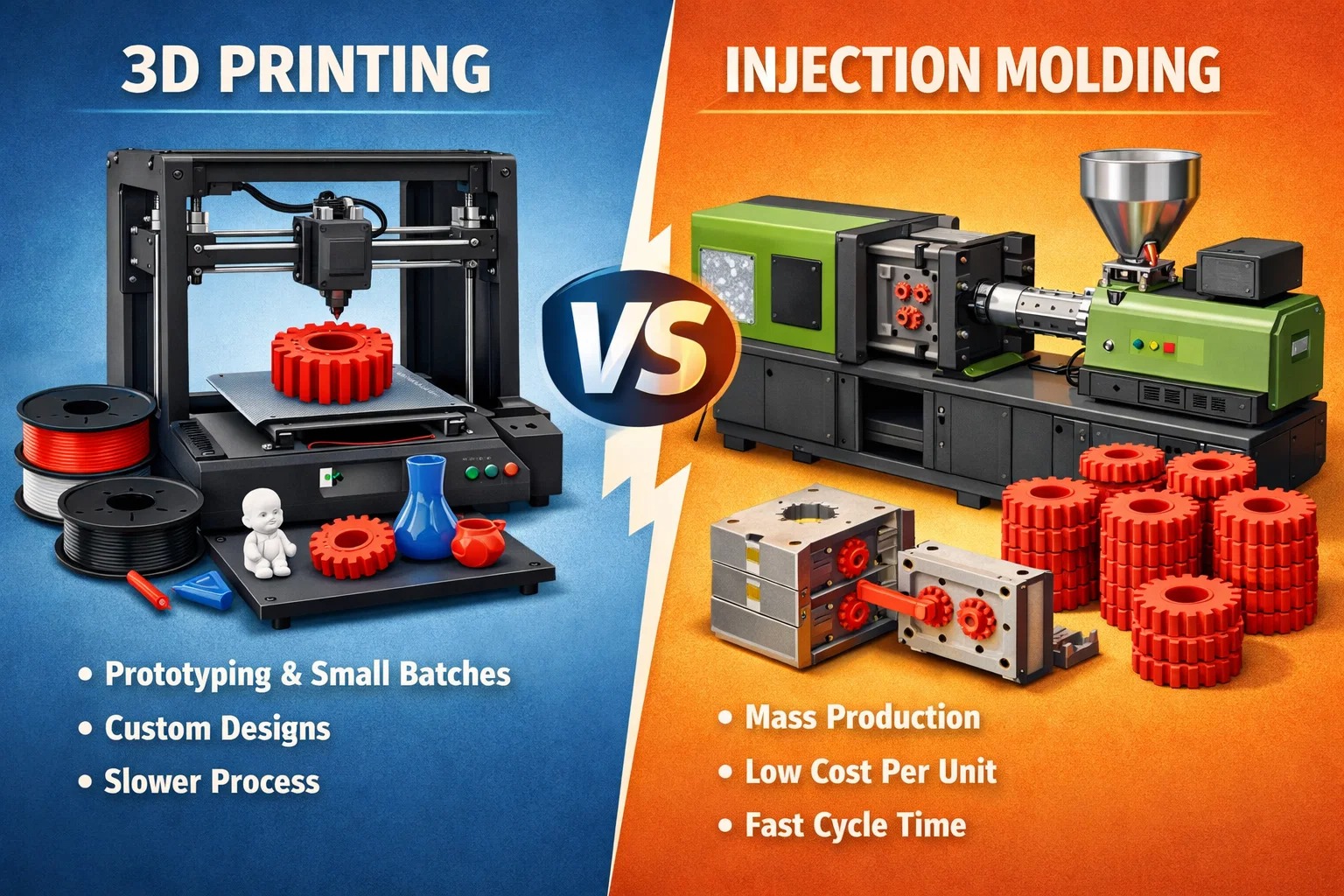 A legtöbben azt gondolják, hogy ez egy egyszerű választás az „új iskola” (3D nyomtatás) és a „régi iskola” (fröccsöntés) között. De őszintén? Már ritkán ilyen fekete-fehér.
