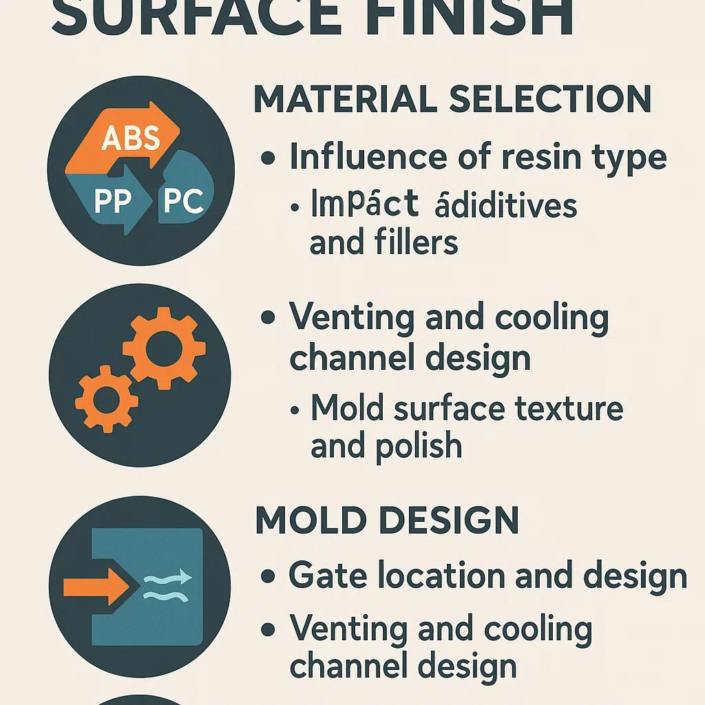 - Szerszám pontosság: A mold dictates the maximum achievable finish. Investing in appropriate penész polírozás (egy adott R-hez a érték ill SPI fokozat ) vagy nagy pontossággal felületi textúra (vegyi vagy lézeres) elengedhetetlen. Helyes szellőztetés és uniform hűtőcsatorna kialakítása a hibák megelőzése érdekében nem alku tárgyát képezik.
