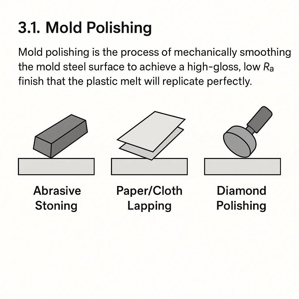 - Szerszámozás: A mold cavity is polished to an SPI A-2 or A-3 befejezni (alacsony R a értékek) minimális felületi érdesség biztosítása érdekében.