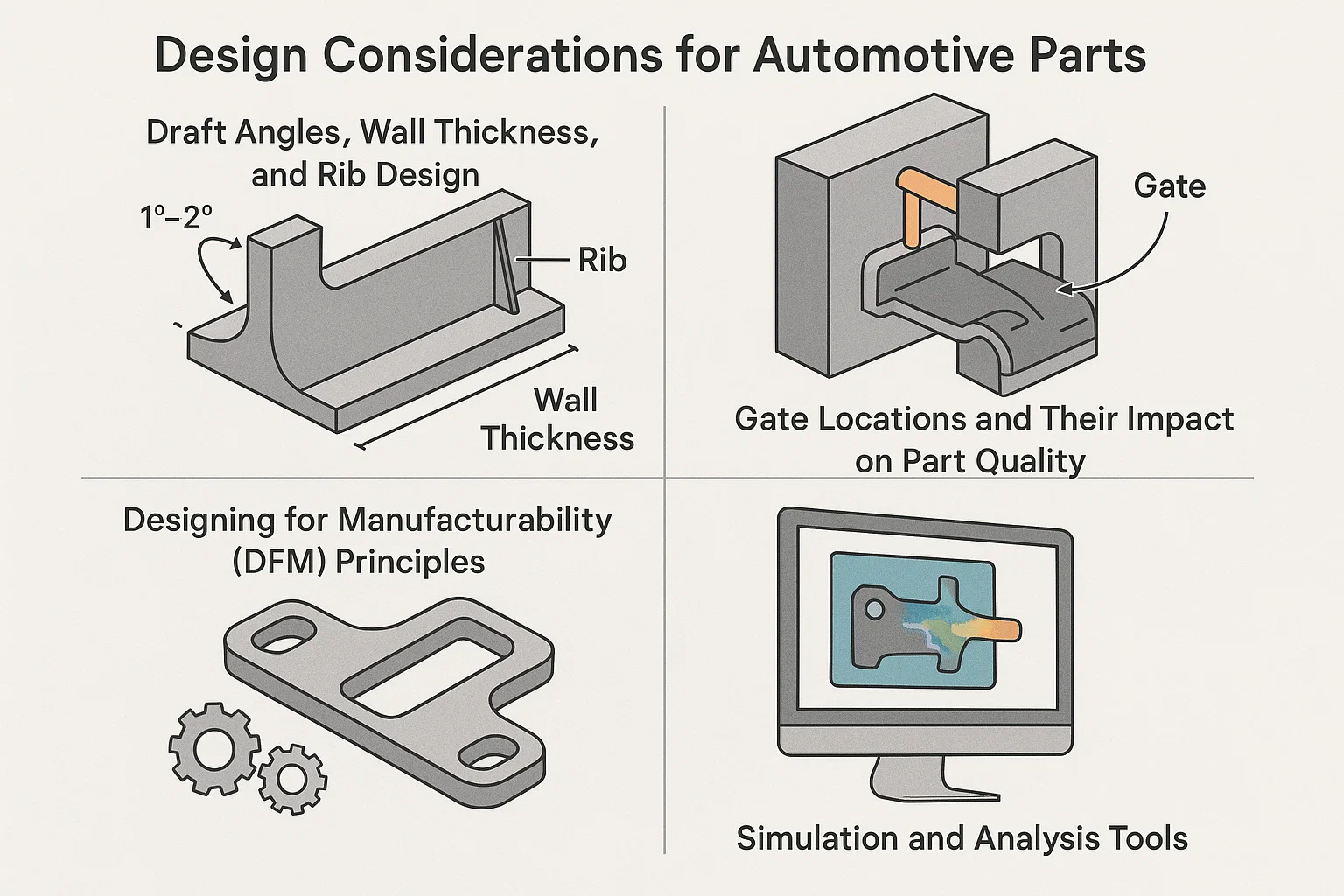 A fröccsöntött és túlzott autóipari alkatrészek sikere egy aprólékos tervezési folyamaton alapul. A jól megtervezett rész nemcsak funkcionális, hanem gyártható, tartós és költséghatékony is. Az alapvető tervezési alapelvek betartása elengedhetetlen az olyan általános kérdések elkerülése érdekében, mint a megsemmisítés, a gyenge kötelékek és a kozmetikai hibák.