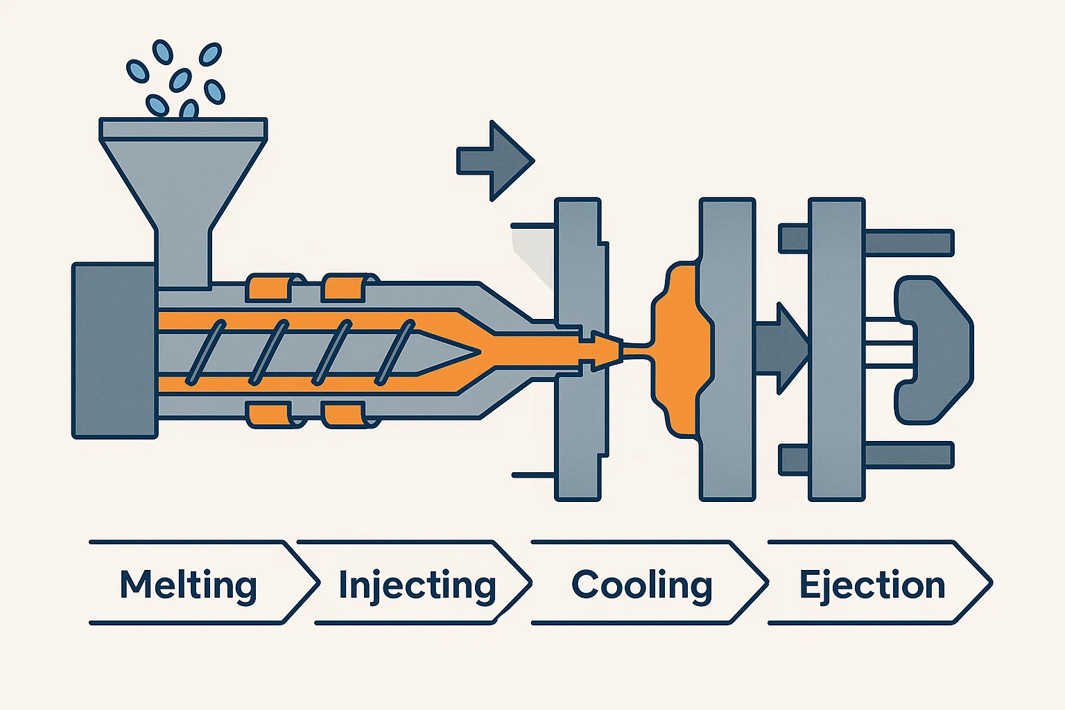 A fröccsöntés folyamata pontos és ciklikus szekvenciát követ: