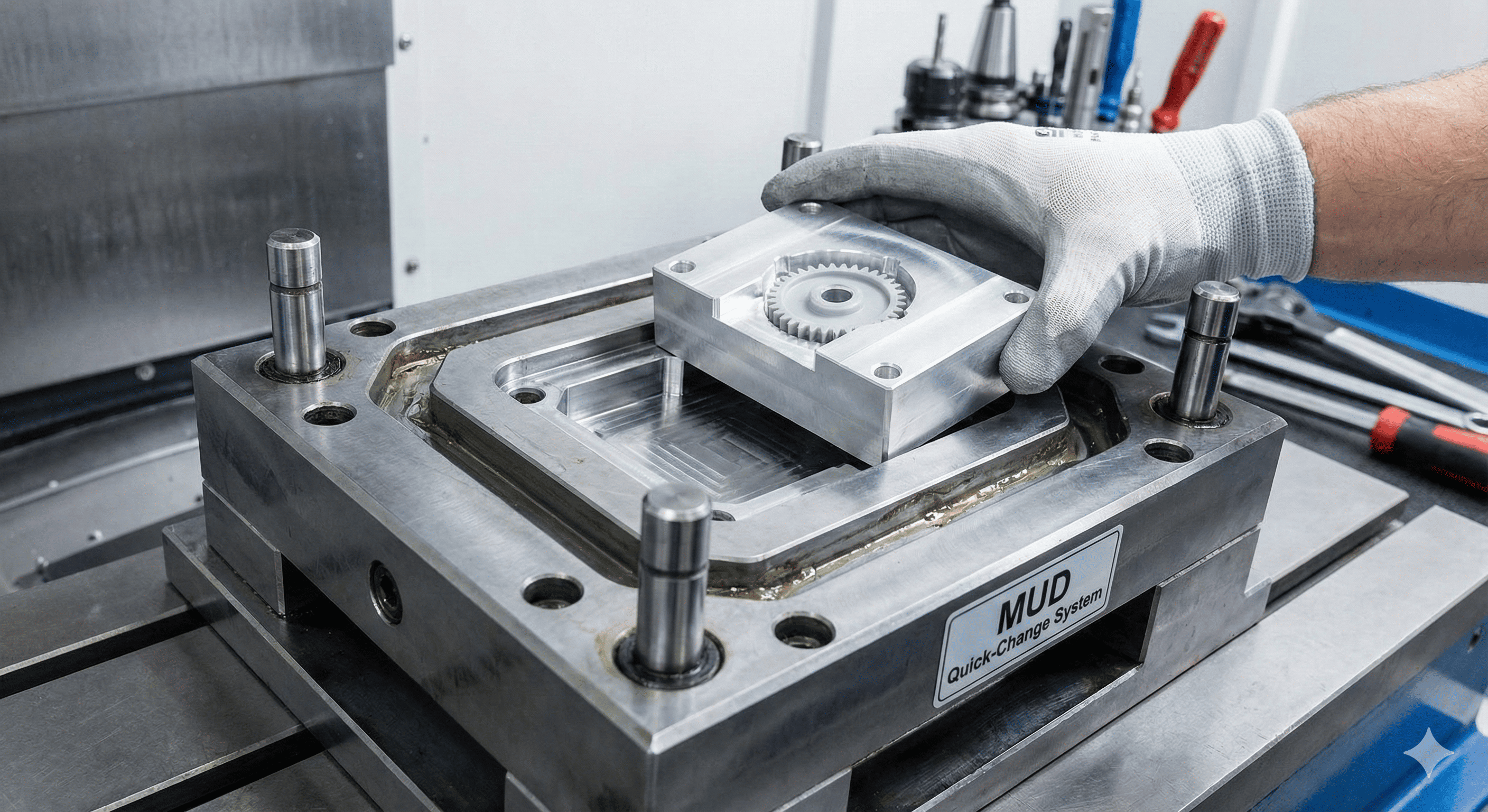 A nehézemelés közben történik Formatervezés . A nagy volumenű gyártás során a ciklusidő minden mikromásodperce miatt aggódik, ezért összetett „vízköpenyt” épít a hűtéshez. Kis térfogatú fröccsöntésnél egyszerűsítjük. használjuk Master Unit Die (MUD) alapok – szabványos keretek, amelyek egyedi betéteket tartalmaznak. Ez azt jelenti, hogy csak az „üreget” (az alkatrész formáját) kell kivágnunk, nem pedig az egész masszív fémtömböt.