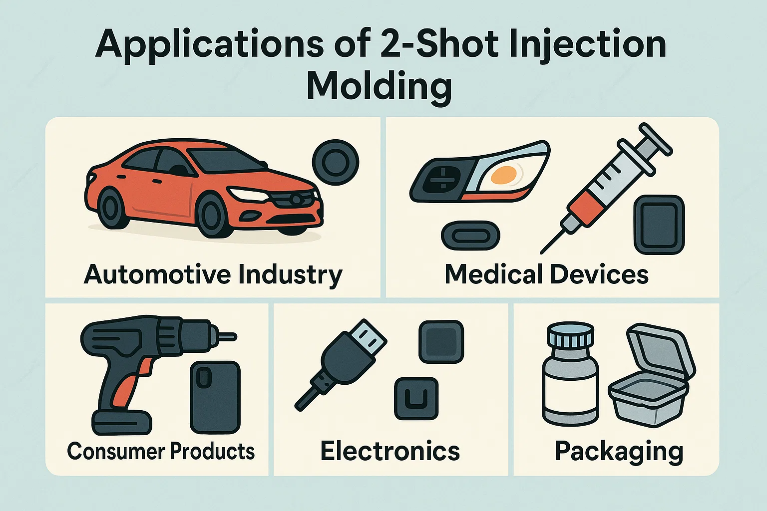 Az autóipar nagymértékben támaszkodik a 2-lövési formázásra mind a belső, mind a külső alkatrészeknél. A tartós és tapintható alkatrészek létrehozására szolgál.