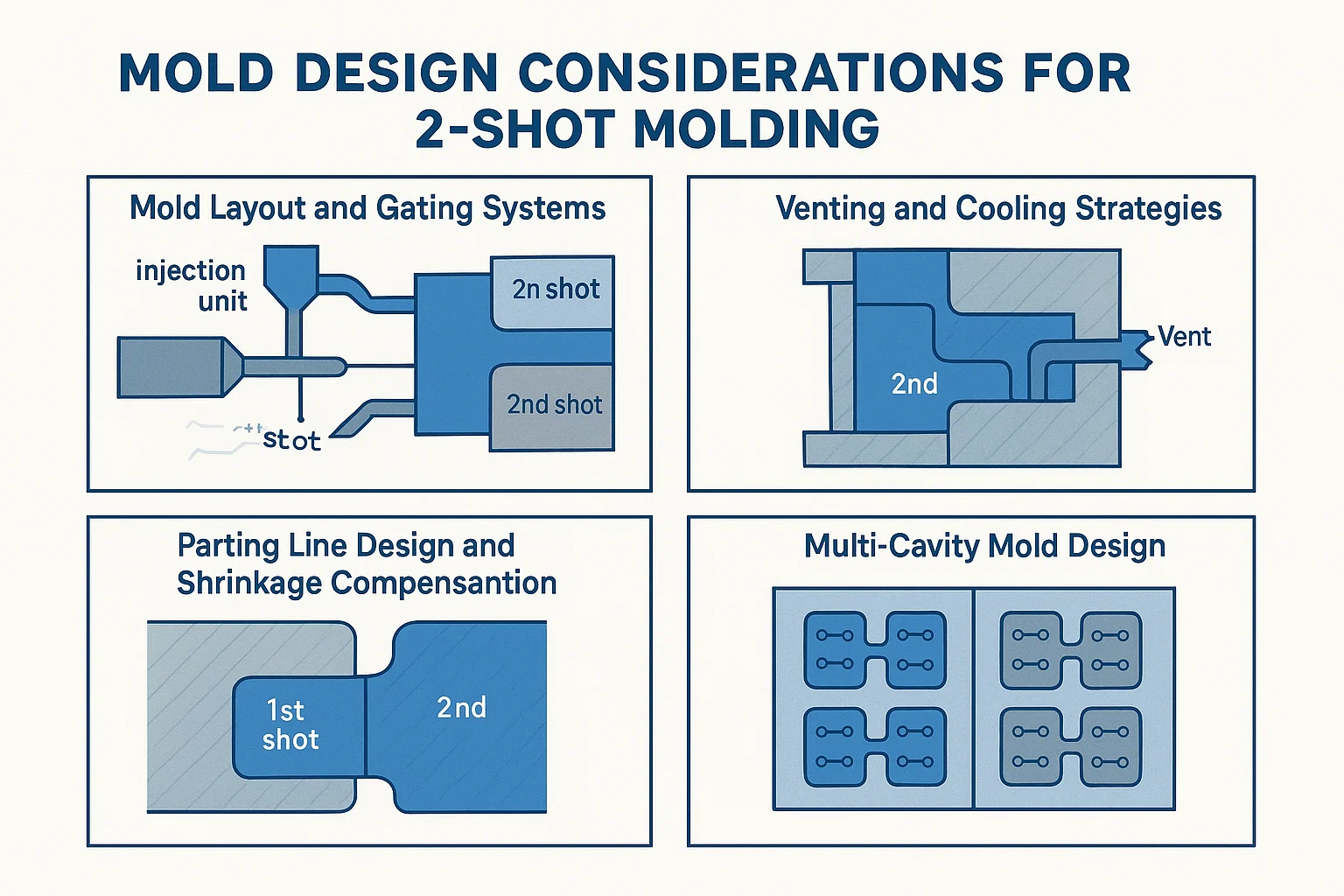 Hatékony szellőztetés Alapvető fontosságú az összes fröccsöntésben, de még kritikusabbá válik a 2-lövés formájában. Mivel a második anyagot az első lövés körül injektálják, a levegő könnyen csapdába eshet kis zsebekben, ami olyan hibákhoz vezet, mint az égési jelek, a rövid lövések vagy a hiányos kötések. A penész kialakításának stratégiailag elhelyezett szellőzőnyílásokat kell tartalmaznia, amelyek lehetővé teszik, hogy ez a levegő elmeneküljön.