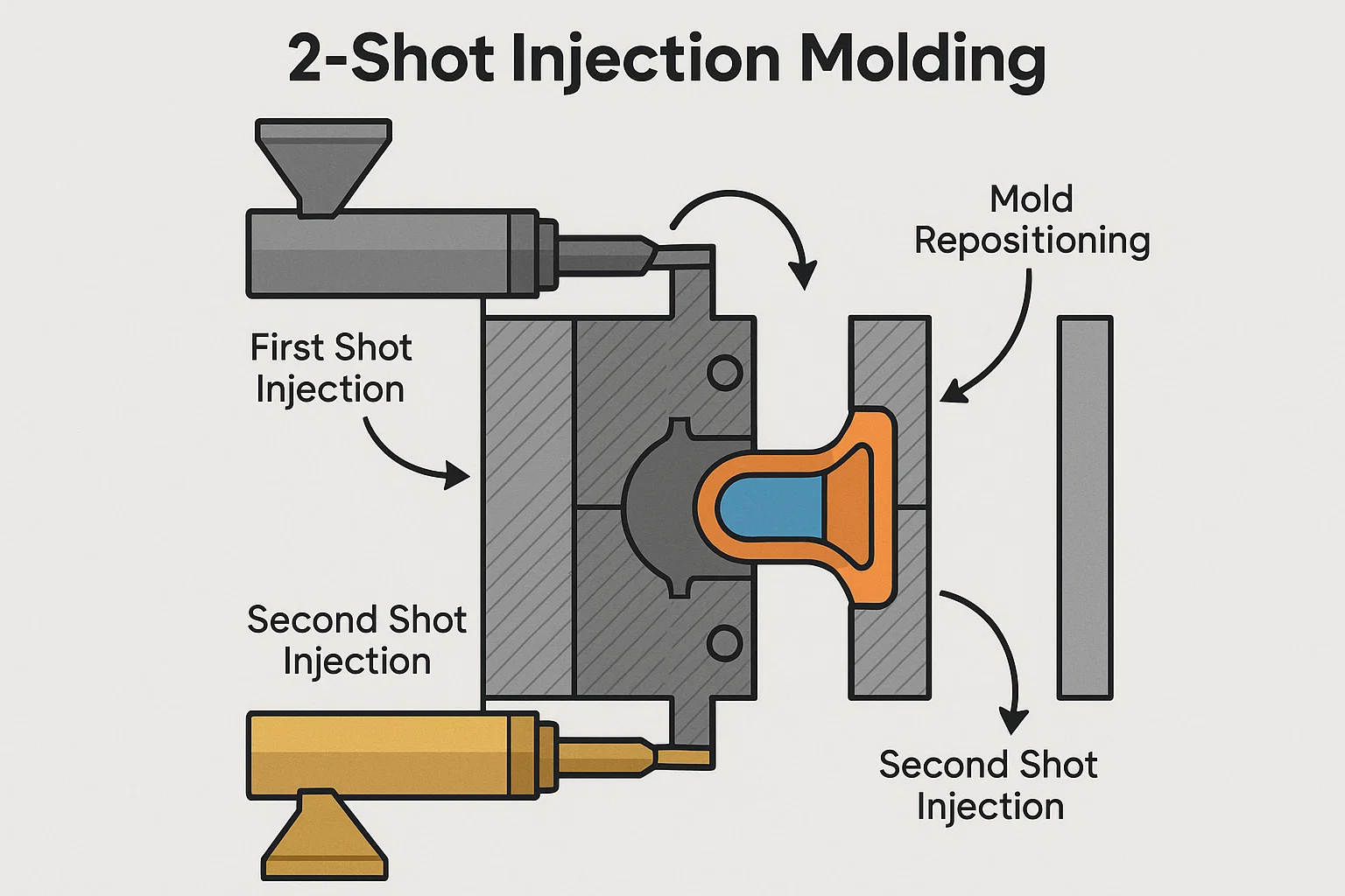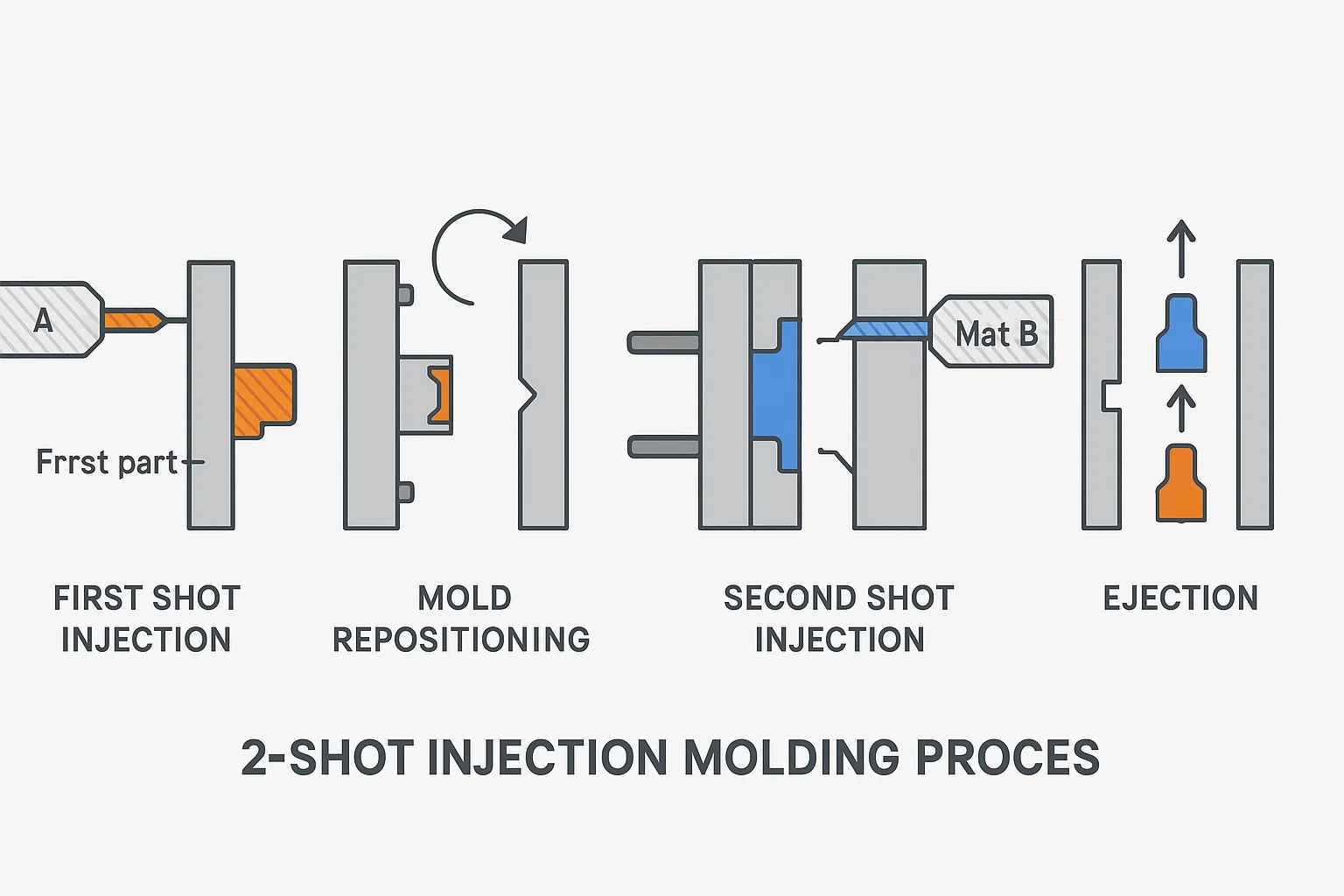 A 2-lövéses fröccsöntés alapelve két anyag szekvenciális injekciója egy speciálisan kialakított penészbe. A folyamat általában ezeket a kulcsfontosságú lépéseket követi: