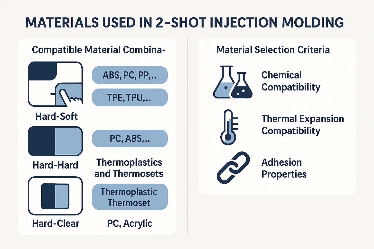 Bármely két lövéses fröccsöntési projekt sikere az anyagok gondos kiválasztásától függ. A két polimernek nemcsak a végtermék funkcionális és esztétikai követelményeinek kell megfelelnie, hanem kompatibilisnek kell lennie egymással, hogy erős, tartós kötést képezzen. Ez a szakasz az anyagkombinációk típusait és azok kiválasztásának kritikus kritériumait vizsgálja.