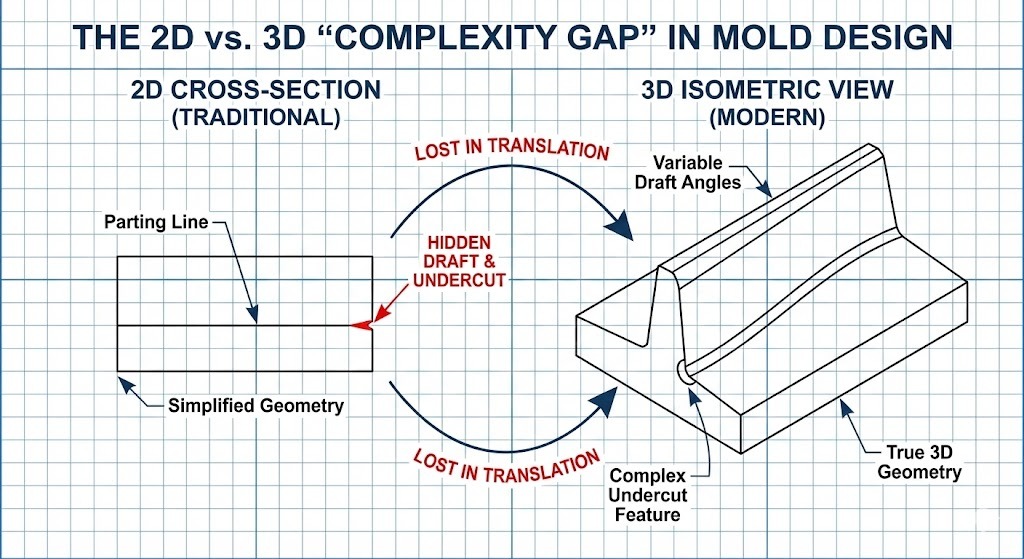 Hagyományos formatervezés jellemzően 2D-s elrendezésekkel kezdődik, amelyek meghatározzák az elválasztó vonalat, a kapuk helyét és a hűtőcsatornákat. Azonban ezeknek a lapos ábrázolásoknak a háromdimenziós fizikai objektummá történő fordítása számos kritikus szűk keresztmetszetet eredményez: