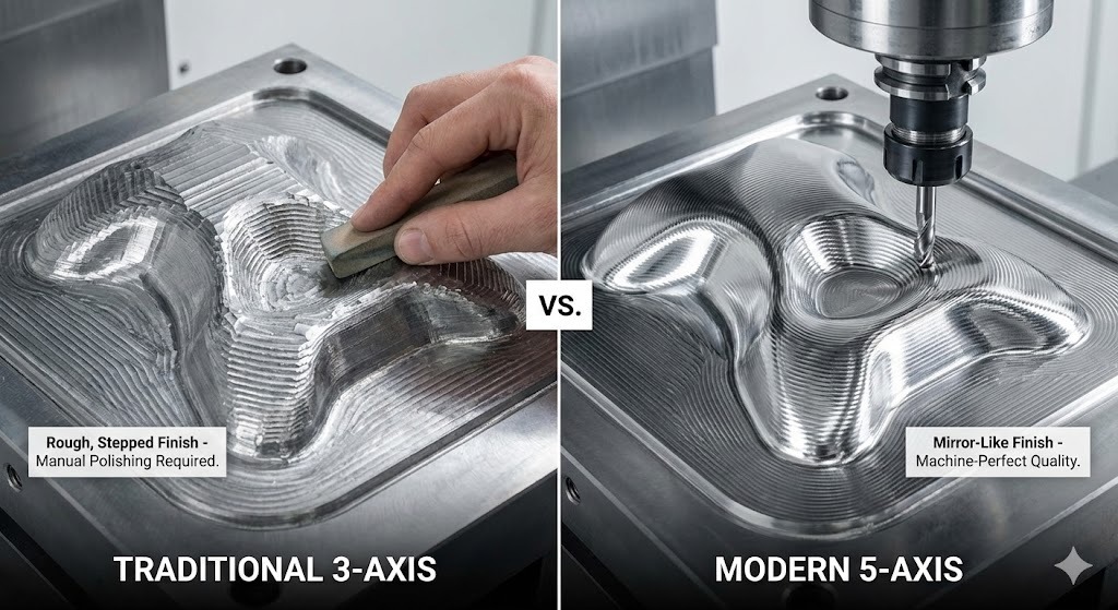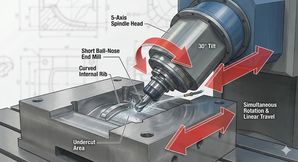 5 tengelyes vágás egy kivonó gyártási folyamat, amelyben egy CNC-gép egy forgácsolószerszámot vagy egy munkadarabot egyszerre öt különböző tengelyen mozgat. In formatervezés Ez a technológia lehetővé teszi, hogy az orsó merőlegesen maradjon az összetett, ívelt felületekre, lehetővé téve mély üregek, meredek falak és bonyolult alávágások létrehozását, amelyeket fizikailag lehetetlen elérni szabványos 3 tengelyes berendezéssel.