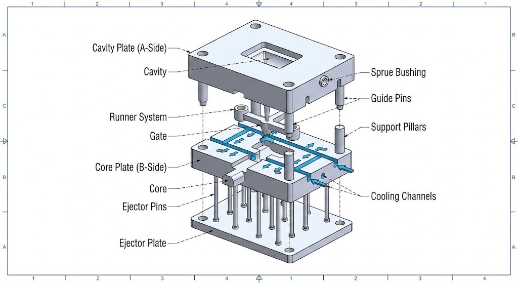 - Az üreg és a mag: Az elsődleges „A” és „B” oldalak, amelyek a műanyag rész alakját alkotják.