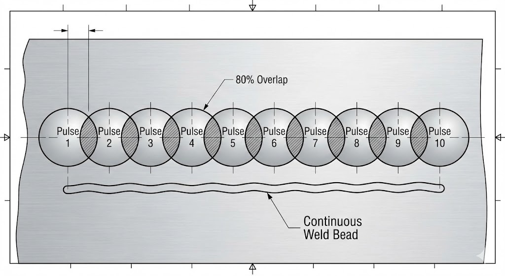 - Folyamatos/átfedő hegesztés: A technikusok átfedik az egyes „pontokat”. 70-80% varrat nélküli, tömör fémgyöngy létrehozásához.