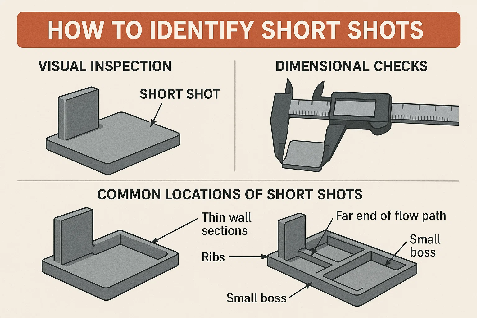 A rövid lövés észlelésének leggyakoribb módja a gyors vizuális ellenőrzésen keresztül. A rövid lövés azonnal nyilvánvaló, mivel az alkatrész hiányos. Észre fogja venni, hogy hiányzik az alkatrész szakaszai, vagy hogy az alkatrész hirtelen egy lekerekített, befejezetlen éltel végződik, ahol a műanyag áramlás leállt. Ez általában egy sima, ívelt felület, mivel az olvadt műanyag felületi feszültsége miatt kissé visszahúzódik, amikor megszilárdul. Ez egy jelzőtale jele, hogy a penészüreg nem volt kitöltve.