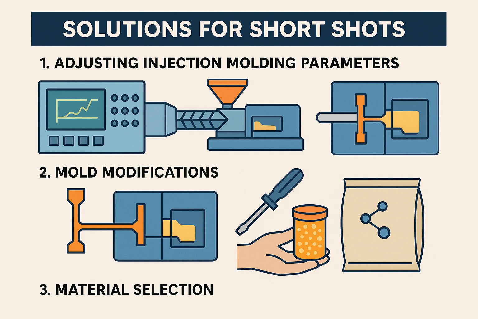 Rövid lövés megoldásához stratégiai megközelítést igényel. Gyakran a legjobb, ha a legegyszerűbb és legköltséghatékonyabb megoldásokkal kezdjük, mielőtt összetettebb és drágábbak. Kezdje a gépbeállításokkal, majd fontolja meg az anyagot, és végül nézze meg magát a penészre.