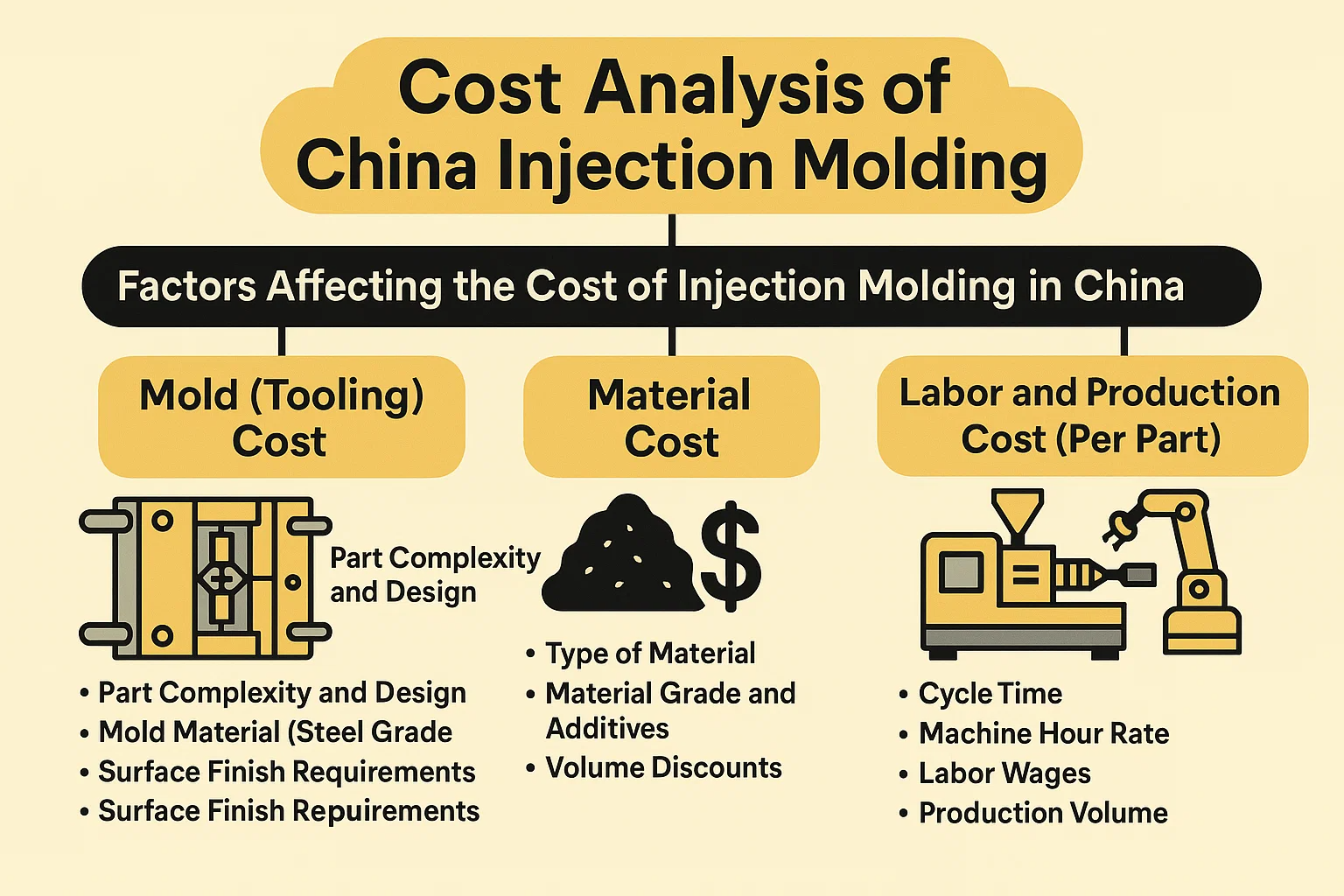 Az egyik elsődleges motiváció a vállalatok számára, hogy Kínát választják a fröccsöntéshez, az észlelt költség -előny. Míg Kína általában versenyképesebb árképzést kínál, mint sok nyugati ország, a különféle tényezők megértése, amelyek hozzájárulnak az általános költségekhez, alapvető fontosságú a pontos költségvetés -tervezés és a váratlan költségek elkerülése szempontjából. A fröccsöntési projekt teljes költsége nagyjából a penész (szerszámok) költségeire, az anyagköltségekre és a termelési (munka/gép) költségekre lehet kategorizálni.